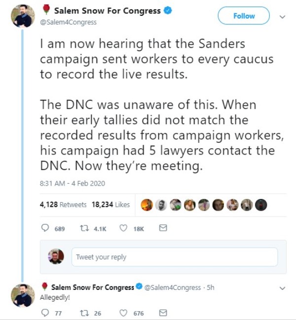 “I am now hearing that the Sanders campaign sent workers to every caucus to record the live results,” Salem Snow (@Salem4Congress) wrote on Twitter. “The DNC was unaware of this. When their early tallies did not match the recorded results from campaign workers, his campaign had 5 lawyers contact the DNC. Now they’re meeting.”